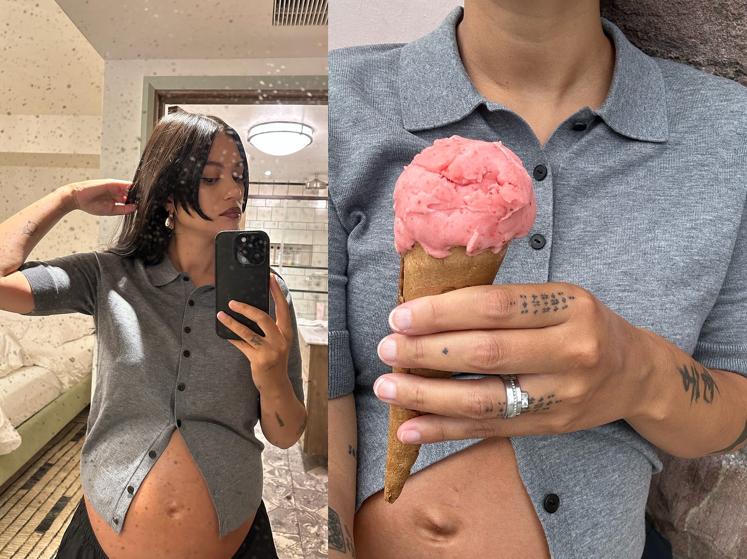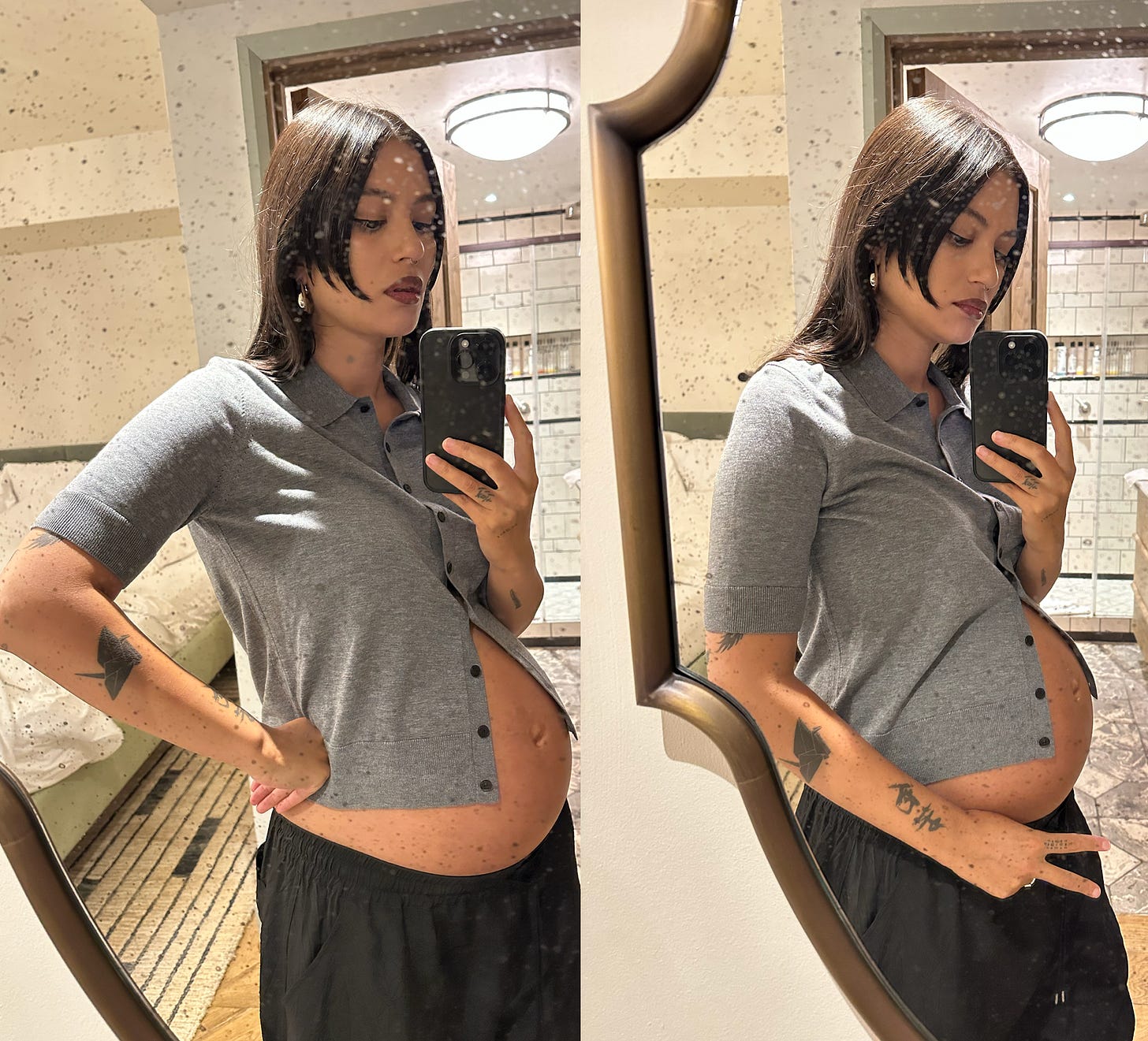 They are only trousers that fit me so I wear them everyday (when I got pregnant instead of buying lots of cheap maternity stuff, I bought one single pair of chic pants and got them tailored around waist and length) Margiela sling backs as I can sufficiently waddle but still feel cute. I am also enjoying these naughty, snug cardigans that frame my belly; I've had a long, bitter fertility journey so it feels good to celebrate my body right now. Frame my joy.