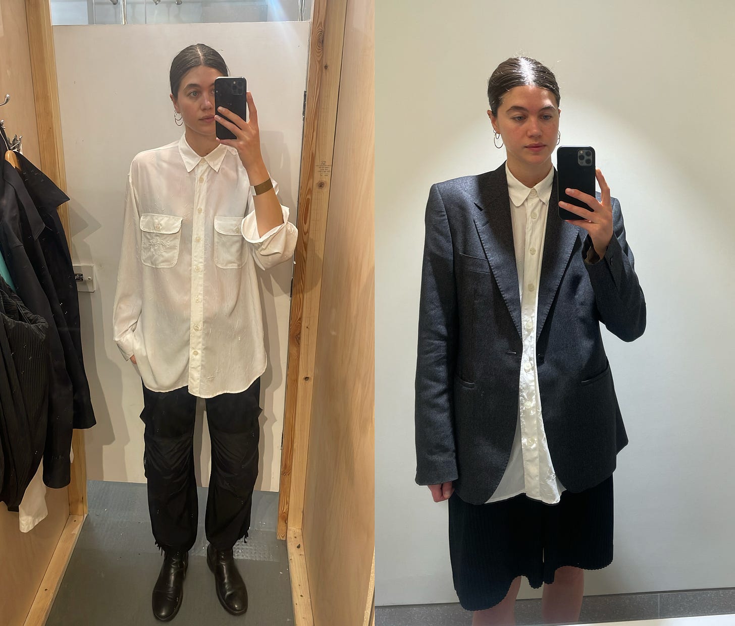 New shirt, two ways. It’s vintage but I think it has an Ann Demeulemeester vibe. Left hand look is (in the shop) with Atsuro Tayama pants and Ann D boots, right hand look is with a secondhand Acne Studios blazer and Issey Miyake Homme Plissé shorts.