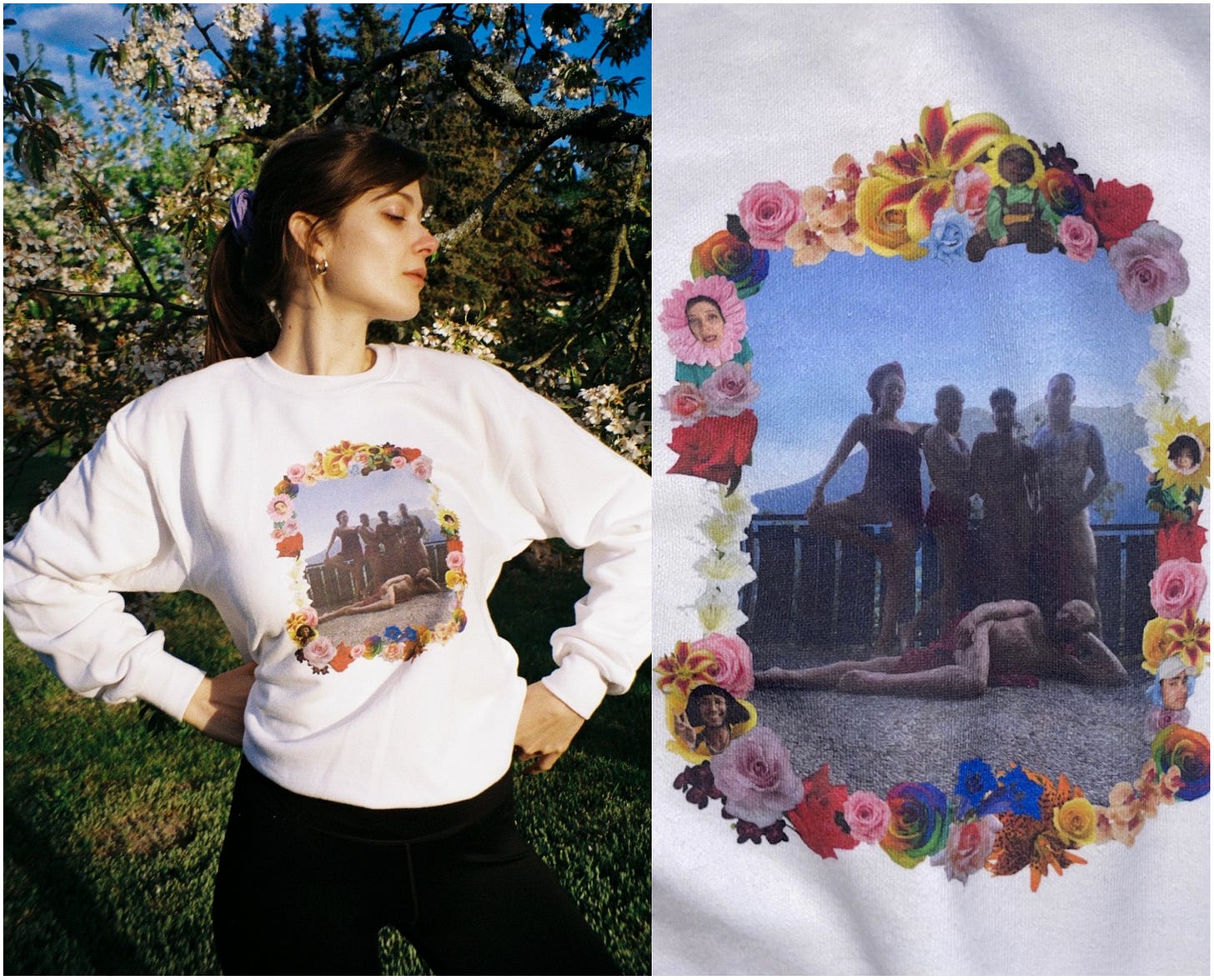 “I chose a sweatshirt that my friends gave me for my birthday. There's a photo of them on it where they're all basically naked, wrapped in towels. When I thought about the piece that makes me feel part of something, I feel like this group has been this consistent grounding place for me since I left school. There are lots of great people in this friend group, and we go on little trips and have little parties. Honestly, they make me laugh - it's fucking exhausting to spend time with them! But it's also so fulfilling. There are great memories attached to this sweater.”