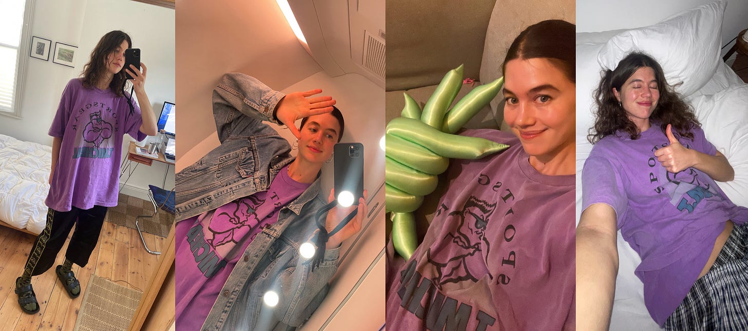 In case you were groaning at all these smug secondhand designer finds, firstly let me remind you that there are loads of shit outfits that I haven’t included here. And secondly, sometimes an enormous purple t-shirt will capture your heart, despite your better judgement.