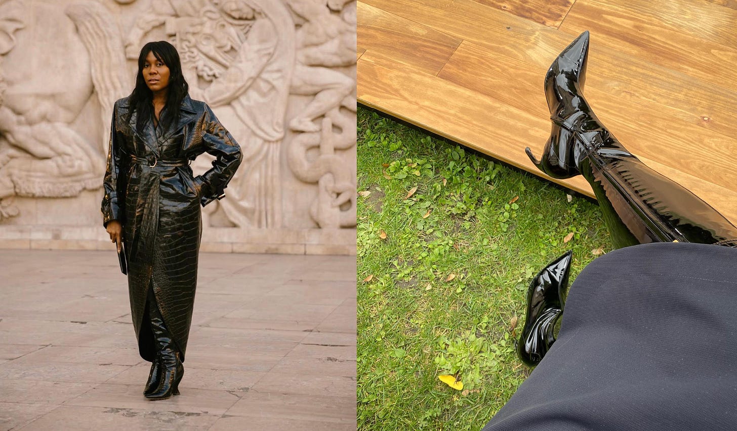 An Alaïa coat and Ferragamo boots.