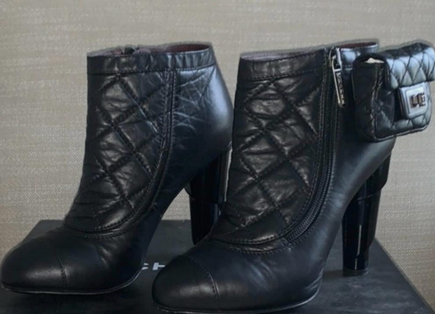 Black boots from Karl Lagerfeld’s S/S08 Chanel collection, inspired by Lindsay Lohan’s ankle monitor.
