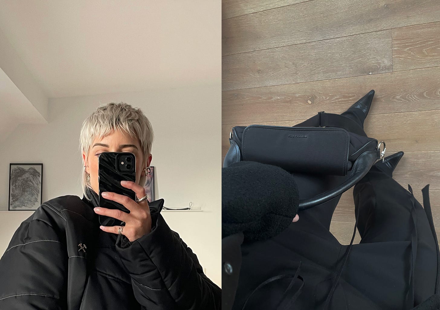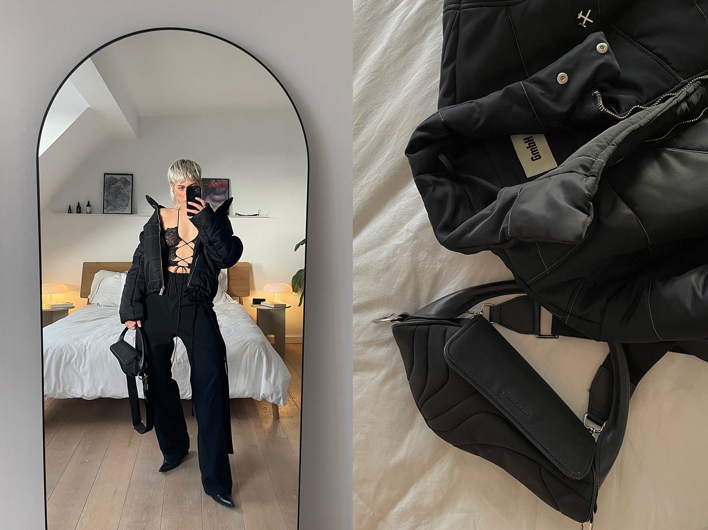 A lace top I recently found from a small Austrian brand called Soda Lingerie, layered with a puffer jacket from GmbH, and my forever favourite Ottolinger trousers. I'm carrying the Owena bag I designed for Serhat and Benjamin’s debut Trussardi show, wearing vintage boots I scored on Vinted (I’m obsessed with the toe shape), and stacked rings from my dear friends at RÄTHEL & WOLF. My ear cuffs are by Alan Crocetti—another friend whose work I love.